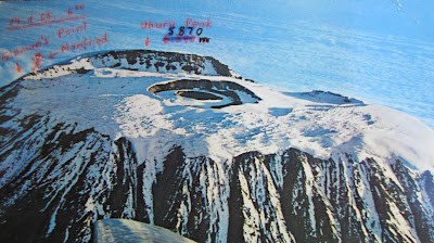 After a long sleep we start our preparations for climbing the mountain. In the distance, far above the clouds, one can see the ice capped summit of Mount Kilimanjaro reflecting the morning sun from its glaciers. Our map shows Uhuru Peak, formerly "Kaiser Wilhelm Spitze", with a height of 19.340 feet, about 5.870 metres. Moshi is about 2.000 metres above sea level. That means we have to climb some 4.000 metres. One does not have to be an experienced climber to get to the top of KIBO which is a volcanic mountain top with an extinct crater in the middle. Uhuru Peak is the highest point of Kibo.